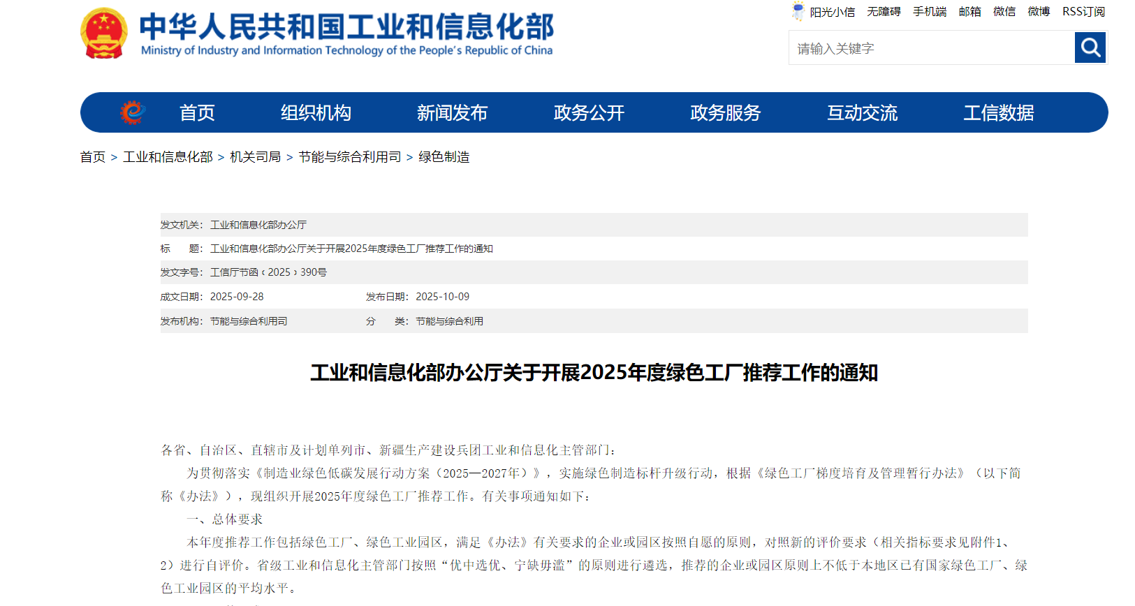 為貫徹落實《制造業綠色低碳發展行動方案(2025—2027年)》,實施綠色制造標桿升級行動,根據《綠色工廠梯度培育及管理暫行辦法》(以下簡稱《辦法》),現組織開展2025年度綠色工廠推薦工作。有關事項通知如下: